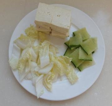 1、青萝卜去皮洗净,白菜洗净。萝卜切成片、豆腐切成5mm后的片,白菜切菱形片。