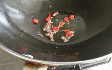 9、锅中留有底油,点小火,将花椒乾t椒炒香后,去掉花椒。