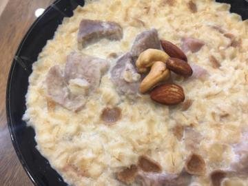 2、将蒸熟的芋头比较烂,可以用汤匙切成小块一点,一个人喜好而定。加入燕麦及牛奶。(容器的6-7分满就好喔,蒸过燕麦会再膨胀)