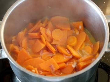 9、炒到红薯和胡萝卜变软,加入高汤去煮。