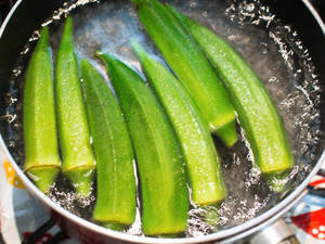 3、烫好的秋葵沥掉热水,并用冷水冲凉。