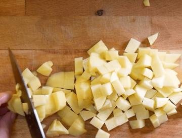 4、切丁后,放进500w微波5分钟加热,取出搅拌一下,在加热一次(5分钟)。接着捣碎。