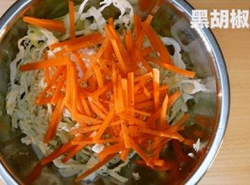 配料:沙拉酱:白醋1大匙、日式美乃滋3大匙、黑胡椒粉适量、砂糖1茶匙