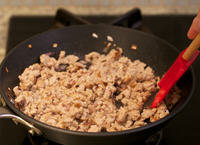等洋葱表面有些半透明的时候将它们拨到一边加入猪肉糜,猪肉糜进锅之后不要急于炒散,先用锅铲压成薄饼状,煎上1-2分钟后翻面,它的表面应该有些金黄,这层薄薄的金黄色可以给肉糜增添许多风味。