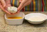 配料:鸡蛋1只,洋葱1/4只(约50克),芝麻油2茶匙(10毫升),盐适量,白胡椒粉1/4茶匙,青葱2根,香菜叶20片,面包糠50克,面粉50克,花生油适量