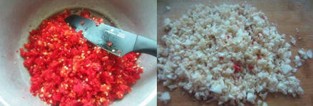 2、辣椒和大蒜(大概为2:1重量比)剁碎,混入豆豉。有蒜蓉的叫蒜蓉辣酱,加了豆豉的叫豆豉蒜蓉辣酱。豆豉可以加也可以不加,随各人喜欢而定。
