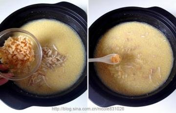 鸡丝干贝小米粥是一款健胃补虚的养生杂粮粥,煮这 个粥时候小米至少要熬煮半小时以上口感才好吃,这款粥很易被胃吸收,容易消化,下面把制作方法分享给大家。
