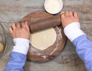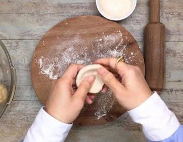 12、擀面棍开始往内旋转擀成面皮 (如果觉得沾黏,请即沾点面粉)