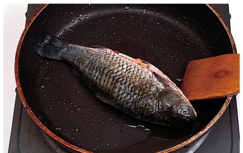 6、再放入鲤鱼略炸,捞起沥油。