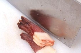 3、将腊肉清洗干净,切成薄片。