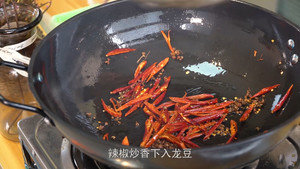 4、辣椒炒香,下入龙豆,白芝麻,撒10克盐,再下入鸡精