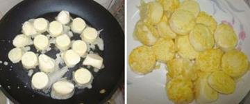 4、平底锅里放入适量的油,烧热,将日本豆腐一块一块放进去中火煎至两面金黄,取出备用。