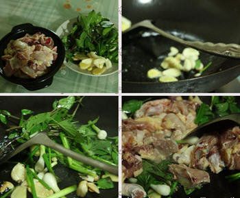 3、放下金不换和香葱(图3),并放入鸡块一起爆炒(图4)。