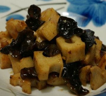 2、将泡发后的木耳洗净切大块,藕去皮切丁。