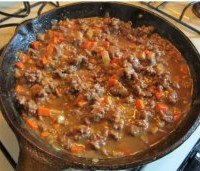 7. 加入面粉,继续翻炒一分钟,混合好后,加入牛肉汤,worcestershire,thyme(百里香),香叶以及切块的胡萝卜,大火煮至沸腾。