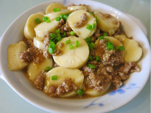 4、烧热油镬落肉碎快炒,加入调味:蚝油1汤匙、豉油和老抽各少许、糖半茶匙、1碗水煮至肉碎熟,加入玉子豆腐煮至滚后,用粟粉水埋茨汁,加埋葱粒便成。