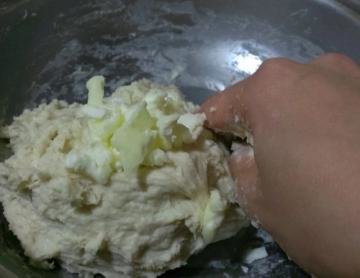 1、牛奶微温加入速发酵母与一点点砂糖静置5分钟;所有粉类、糖与盐搅拌均匀,将酵母与牛奶倒入八成,一边搅拌视面团状况添加牛奶。