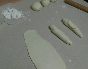 4、面团分为六小份,每份约65克,整形滚圆盖上保鲜膜松弛15分钟。取一份面团杆成宽约8公分长条状,再卷成纺锤状(如图左到右),松弛10分钟。