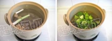 3、砂锅中一次性倒足清水,大火加热沸腾后,倒入排骨,料酒,葱段和姜,加盖用文火煲40分钟之后,倒入苦瓜块,继续煲10分钟。食用前根据个人口味调入少许盐即可。
