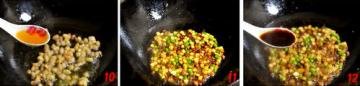 11、待肉丁缩小,有点变黄时,加入笋丁、香菇丁和青碗豆炒匀。