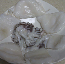 2、墨鱼去除内脏、清理干净头部、把墨鱼切花刀;