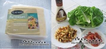 这上面就是做凯撒沙拉的主要食材。左图为帕马森奶酪。右图是从超市买的凯撒沙拉酱,自己烤的面包丁,煸好的培根还有刚从我家菜园里摘的生菜。