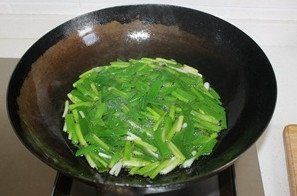 2、将炒锅放入食用油烧到微热,扔一段葱下去微微起泡的状态,现将葱白部分放进去,如果只用葱叶就省略这一步;