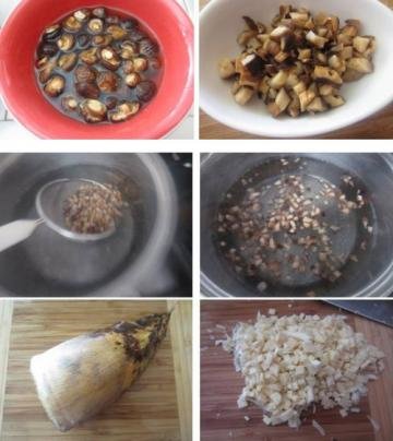 2、香菇、海参丁,鸡肉丁,火腿丁,干贝丝和笋丁焯水备用。