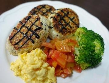 5、把已完成的汉堡排,花椰菜,散蛋,番茄丁 摆盘 汉堡排上挤上芝麻酱即可完成。