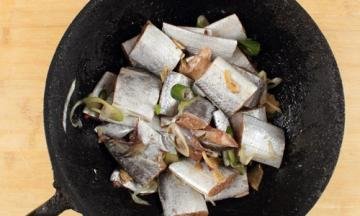 3、锅烧热放适量油,下带鱼段两面煎焦黄,表面焦脆盛出。