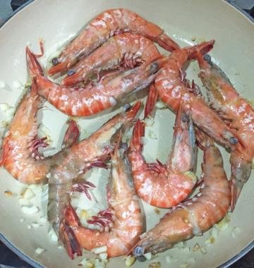 3、锅子倒入少许的油,以中小火将大虾煎至7、8分熟(两面变红即可),起锅备用。