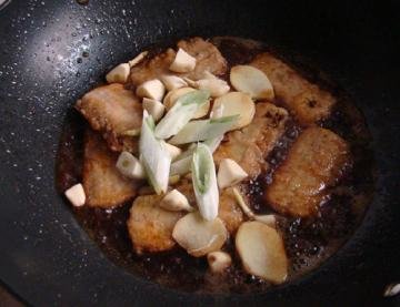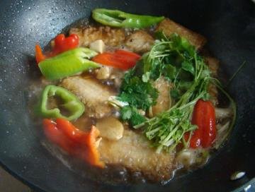 9、加入少许热水、盐、糖定好味。下青红椒、香菜,用中火烧十几分钟。
