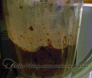 3、用搅拌机将煮烂的红豆和汤汁一起搅拌成泥。