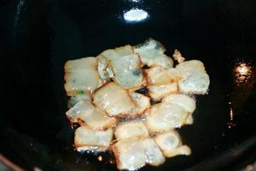 4、锅中加少许油,然后将肥肉下锅,小火慢慢翻炒。