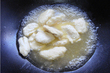 6、锅中坐宽油,4成热时,用勺子逐片下入鸡胸肉。