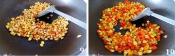 10、加入红黄椒丁、青椒丁、胡萝卜丁翻炒至变色。