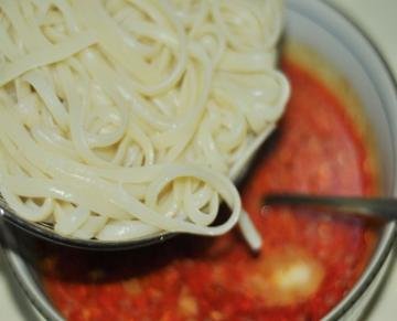 6、锅里坐水,放入一些盐,烧开后,放入牛筋面,煮至面条熟透,颜色发白。捞起装入调好的碗里。