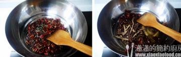 4、炒锅放2匙油,保持小火,放入花椒、辣椒段炒到焦黄后,放入陈皮丝炒出香味,最后放入姜葱蒜爆香。
