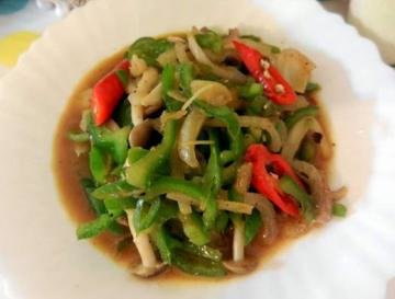 主料:青椒半颗,洋葱半颗,寿喜菇半包,猪肉丝半碗
