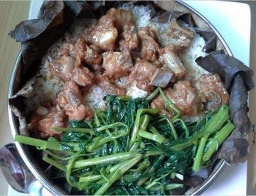 2、如果想省事的,可以将事先蒸好的米饭铺在荷叶上,再放上排骨一起蒸10分钟左右就可以吃了。