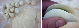 1、面粉加入开水烫成面团,揉光搓条下剂子,擀成圆皮。再放入馅心。