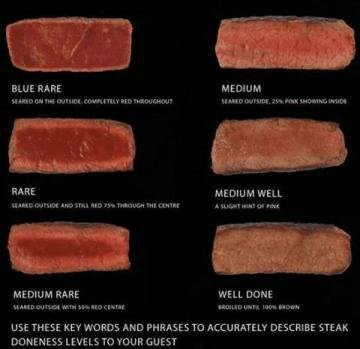 总的来说,随着牛排越来越熟,牛排的口感会越来越硬,汁水也变得更少。三分、五分和七分是相对来说口感比较好的熟度。