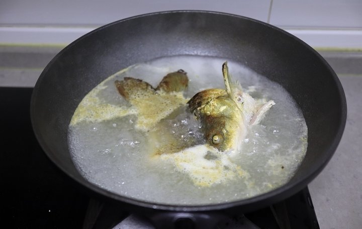 3. 炒锅加热,油量跟平时炒菜的量那么多,油温7、8成热时,将鱼头鱼尾入锅,先不要翻动,煎2-3分钟,待底部定型并且微焦时翻身煎另一面;