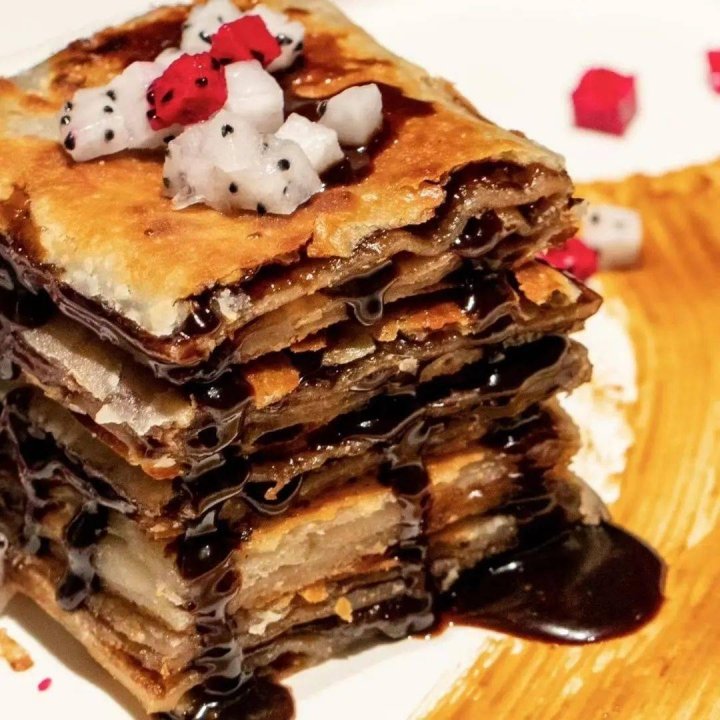 说起主食,东直门糖饼必须要点,外形酷似拿破仑,轻轻咬开酥脆的面皮,里面的红糖和芝麻酱直接爆开,口感像极了熔岩蛋糕,让人欲罢不能;跟羊肉绝配的当属麻酱烧饼,用半发面做的,咬起来酥脆有声,而且趁热乎的才更香;而另一道小食炸响铃,可以当涮品又可以当主食,同样是后厨们当天手工自制,口感十分酥脆,而且还有浓郁的豆香,特别新潮的是,里面竟还夹入了海苔。