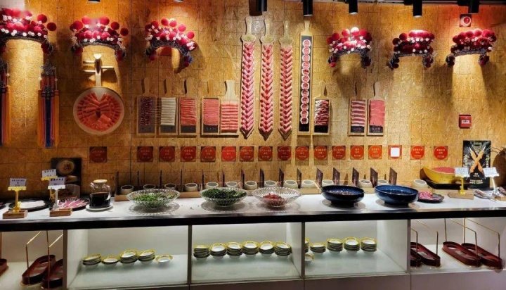而羊大爷之所以能拿米其林餐盘奖,不妨这边移步来看看它家特别有创意的羊肉盛器。黄金手切元宝肉,新鲜的羊肉直接被放进金色的“大元宝”,此时大部分人都不着急吃肉了,光这“大元宝”就足以让人拿着手机拍拍拍;蒙羊腿大宝剑、羊大爷大宝剑和羊肉筋大宝剑,下肉的时候那叫一个气势恢宏;另外的一米板可谓“一直被模仿从未被超越”;还有心形羊腱子、菊花羊肉的容器也都很有特色,时时刻刻彰显着店家心思。