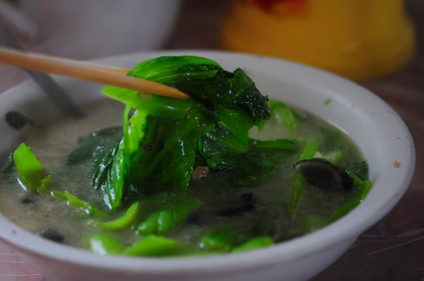要是这样还觉得太清淡的话,芥菜放在肉汤里煮,也相当不错。猪肉汤猪骨汤,鸡汤鱼汤,不拘什么肉汤,只要你吃得惯,都可以煮一把芥菜进去,芥菜的苦味煮出来一些,进汤里,油没那么大了,汤的味道更好了,肉类的荤香里,有芥菜淡淡的苦凉味中和着,别样的香醇,光汤就能喝好几大碗。