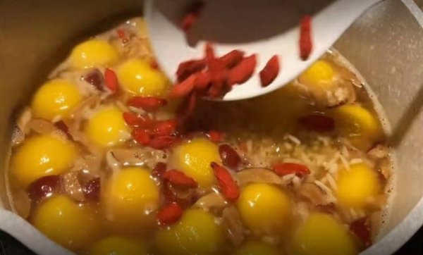 步骤6:等待红薯糯米丸子都煮至浮上来,倒入酒酿150克,加上一些枸杞子,均匀搅拌几下,再次将其煮沸。