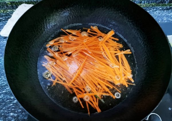 第四步:接着把备好的红萝卜丝,放入锅中焯水1分钟左右,然后捞出控水,备用。