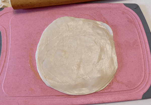 2、把饺子皮放在案板上,用擀面杖擀大擀薄,尽量擀得越薄越好,因为刷了油,饺子皮不会粘在一起,擀成巴掌大的圆饼就行了。