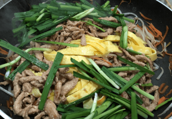 8、锅里留底油,烧热后倒入腌好的肉丝,快速滑炒半分钟,变色后盛出。再加入少许油,倒入胡萝卜丝、豆芽,快速翻炒至断生,加入泡好的粉丝,继续翻炒半分钟。